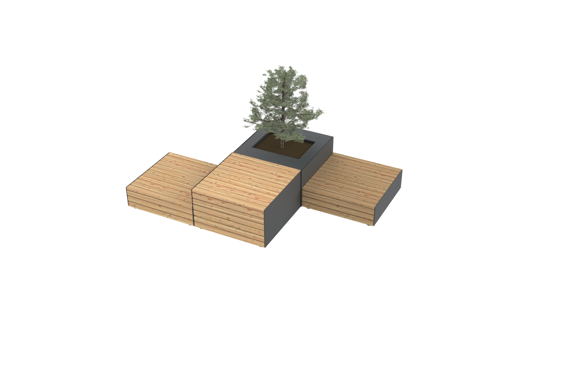 Dank der hohen Modularität ist das System besonders planungsfreundlich. Der Aufwand bleibt gering, die gestalterischen Möglichkeiten groß. Ob als Pilotprojekt oder als großflächiges Gestaltungskonzept – die Skalierbarkeit macht den Einsatz einfach und effizient. Natürlich robust Für die Konstruktion setzen wir auf eine ehrliche Kombination aus langlebigen Materialien: Lärchenholz und duplex-beschichteter Stahl. Das Holz sorgt für Wärme und Aufenthaltsqualität, der Stahl für Stabilität und eine moderne Optik. Zusammen ergeben sie ein Möbelprogramm, das ebenso einladend wie widerstandsfähig ist – ideal für den dauerhaften Einsatz im Außenraum.