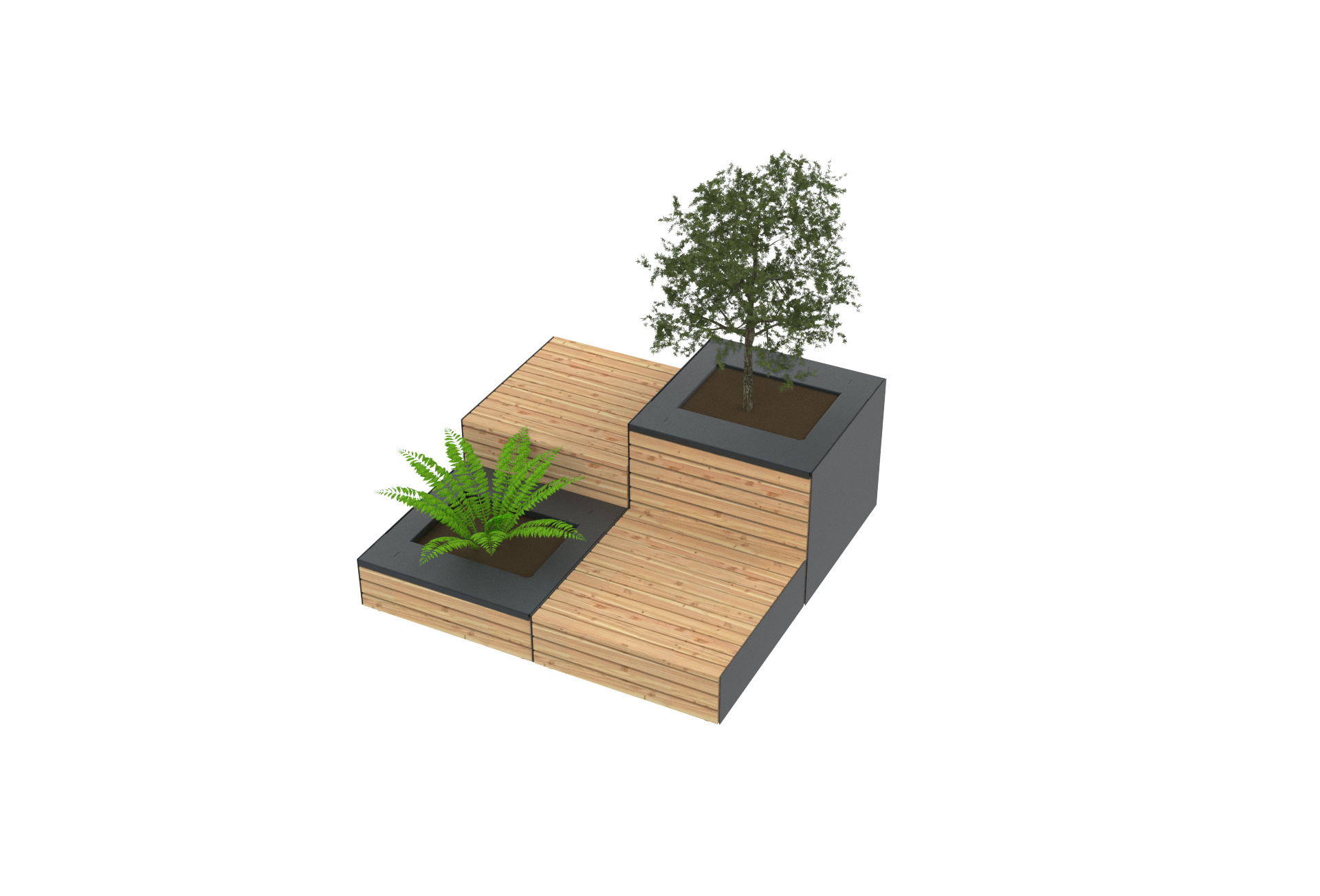 Dank der hohen Modularität ist das System besonders planungsfreundlich. Der Aufwand bleibt gering, die gestalterischen Möglichkeiten groß. Ob als Pilotprojekt oder als großflächiges Gestaltungskonzept – die Skalierbarkeit macht den Einsatz einfach und effizient. Natürlich robust Für die Konstruktion setzen wir auf eine ehrliche Kombination aus langlebigen Materialien: Lärchenholz und duplex-beschichteter Stahl. Das Holz sorgt für Wärme und Aufenthaltsqualität, der Stahl für Stabilität und eine moderne Optik. Zusammen ergeben sie ein Möbelprogramm, das ebenso einladend wie widerstandsfähig ist – ideal für den dauerhaften Einsatz im Außenraum.