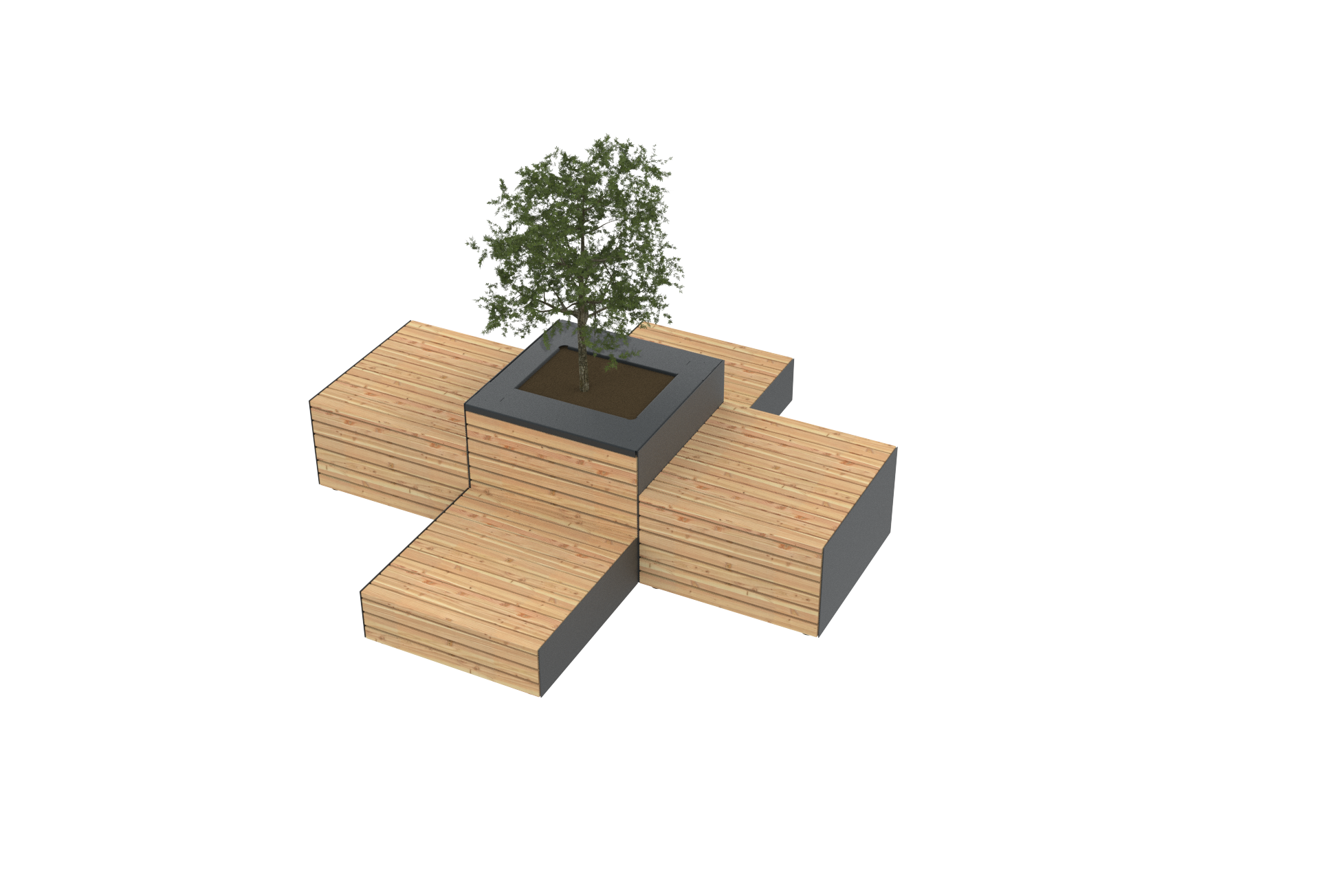 Dank der hohen Modularität ist das System besonders planungsfreundlich. Der Aufwand bleibt gering, die gestalterischen Möglichkeiten groß. Ob als Pilotprojekt oder als großflächiges Gestaltungskonzept – die Skalierbarkeit macht den Einsatz einfach und effizient. Natürlich robust Für die Konstruktion setzen wir auf eine ehrliche Kombination aus langlebigen Materialien: Lärchenholz und duplex-beschichteter Stahl. Das Holz sorgt für Wärme und Aufenthaltsqualität, der Stahl für Stabilität und eine moderne Optik. Zusammen ergeben sie ein Möbelprogramm, das ebenso einladend wie widerstandsfähig ist – ideal für den dauerhaften Einsatz im Außenraum.