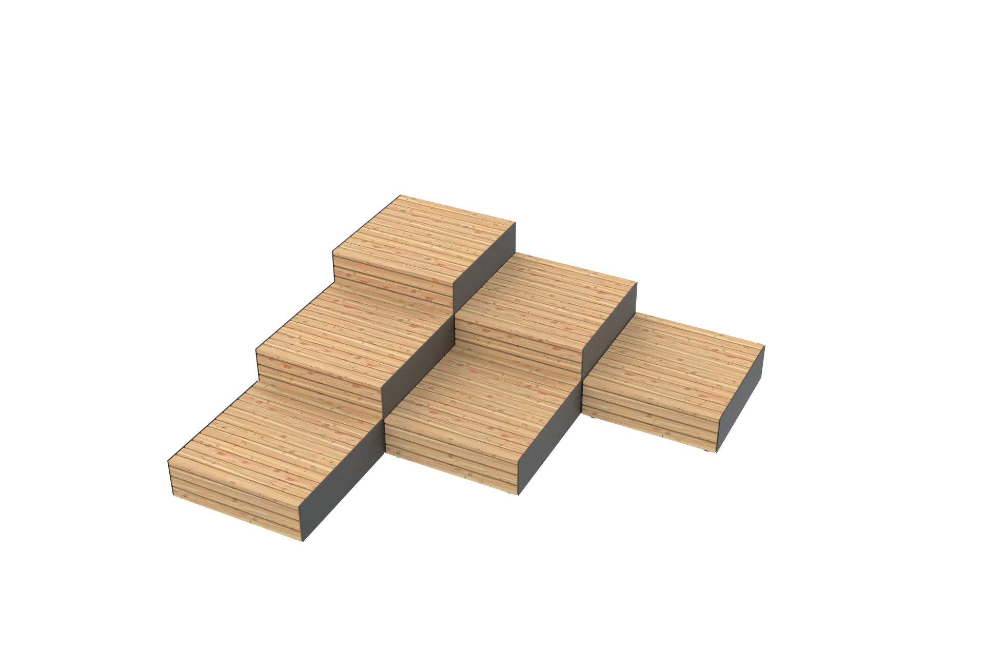 Dank der hohen Modularität ist das System besonders planungsfreundlich. Der Aufwand bleibt gering, die gestalterischen Möglichkeiten groß. Ob als Pilotprojekt oder als großflächiges Gestaltungskonzept – die Skalierbarkeit macht den Einsatz einfach und effizient. Natürlich robust Für die Konstruktion setzen wir auf eine ehrliche Kombination aus langlebigen Materialien: Lärchenholz und duplex-beschichteter Stahl. Das Holz sorgt für Wärme und Aufenthaltsqualität, der Stahl für Stabilität und eine moderne Optik. Zusammen ergeben sie ein Möbelprogramm, das ebenso einladend wie widerstandsfähig ist – ideal für den dauerhaften Einsatz im Außenraum.